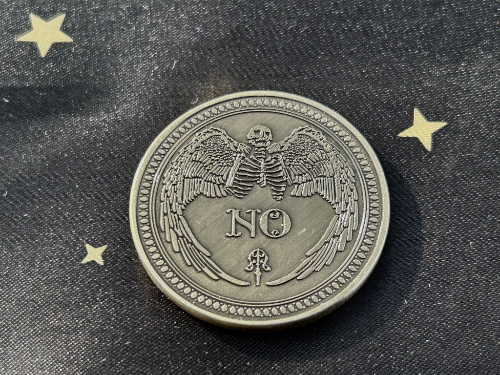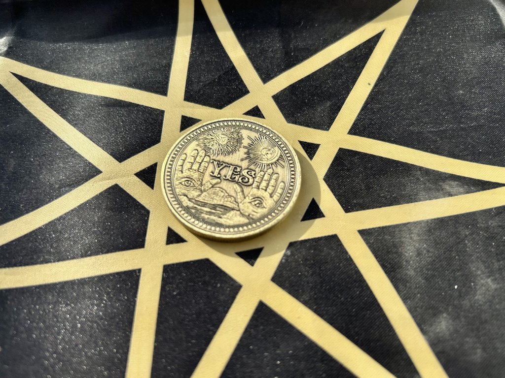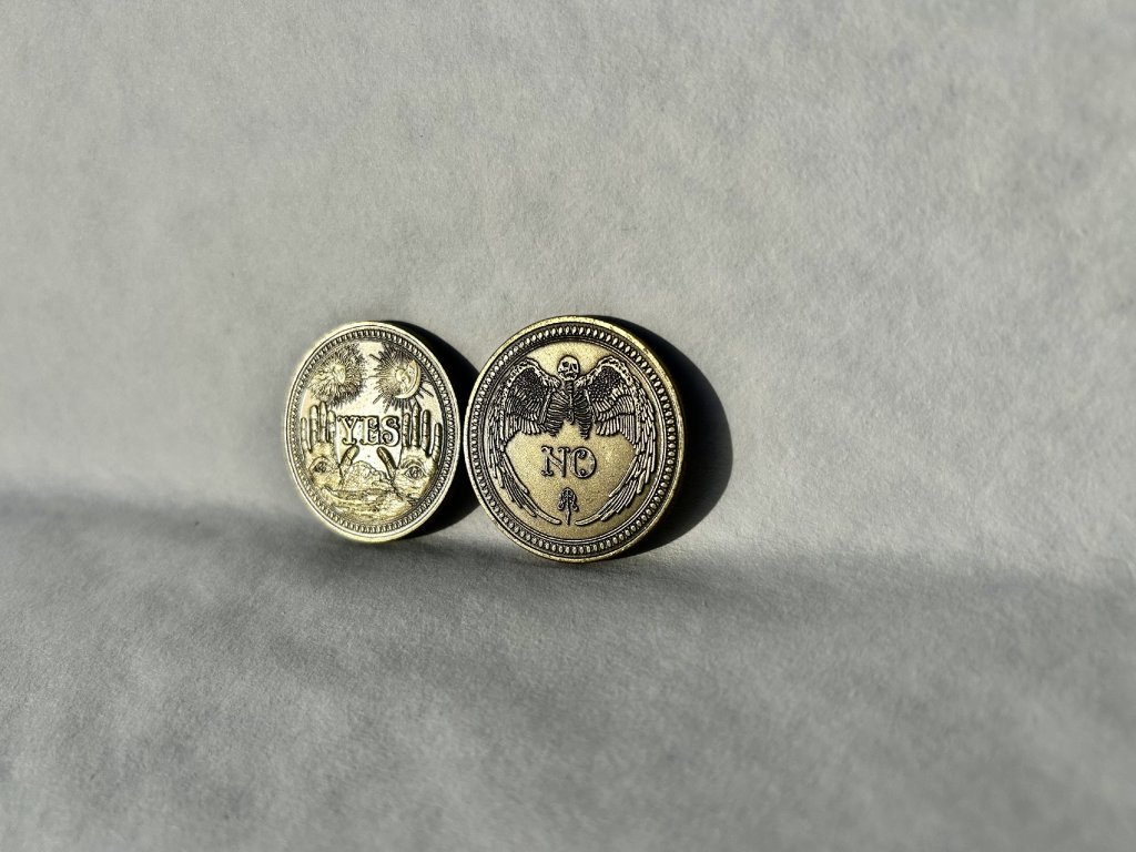 Veštecká minca Áno/Nie je oceľový talizman v hlbokej bronzovej farbe s gotickými motívmi, slúžiaci na rýchle veštenie a rozhodovanie. Priemer: 4 cm, hrúbka: 3 mm, váha cca 15 g – pohodlná na nosenie v vrecku, na oltári alebo ako prívesok.Strana ÁNO: